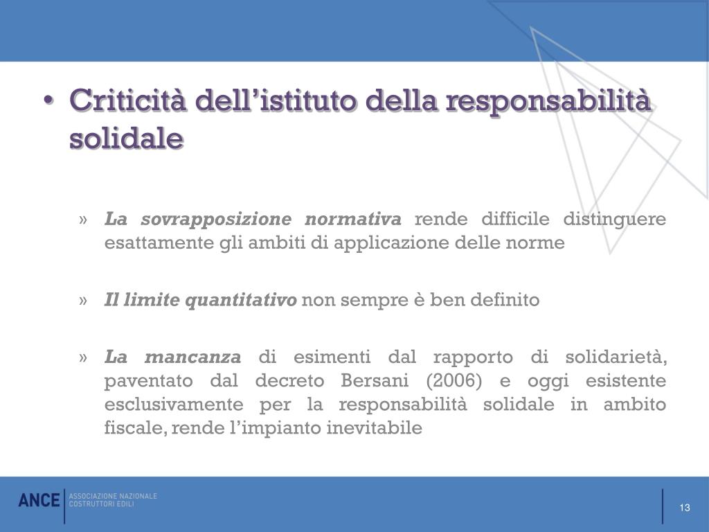 Criticità dell’istituto della responsabilità solidale • La sovrapposizione normativa rende difficile distinguere esattamente gli ambiti di applicazione delle norme • Il limite quantitativo non sempre è ben definito • La mancanza di esimenti dal rapporto di solidarietà, paventato dal decreto Bersani (2006) e oggi esistente esclusivamente per la responsabilità solidale in ambito fiscale, rende l’impianto inevitabile 13