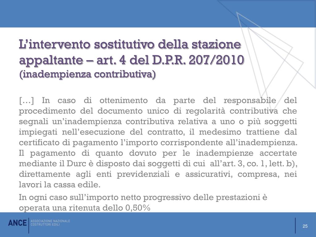 L’intervento sostitutivo della stazione appaltante – art. 4 del D.P.R. 207/2010(inadempienza contributiva) […] In caso di ottenimento da parte del responsabile del procedimento del documento unico di regolarità contributiva che segnali un’inadempienza contributiva relativa a uno o più soggetti impiegati nell’esecuzione del contratto, il medesimo trattiene dal certificato di pagamento l’importo corrispondente all’inadempienza. Il pagamento di quanto dovuto per le inadempienze accertate mediante il Durc è disposto dai soggetti di cui all’art. 3, co. 1, lett. b), direttamente agli enti previdenziali e assicurativi, compresa, nei lavori la cassa edile. In ogni caso sull’importo netto progressivo delle prestazioni è operata una ritenuta dello 0,50% 25