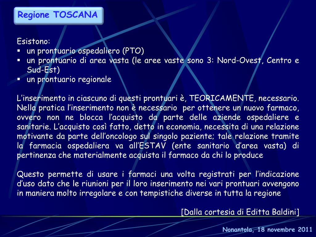 Regione TOSCANA • Esistono: • un prontuario ospedaliero (PTO) • un prontuario di area vasta (le aree vaste sono 3: Nord-Ovest, Centro e Sud-Est) • un prontuario regionale • L’inserimento in ciascuno di questi prontuari è, TEORICAMENTE, necessario. • Nella pratica l’inserimento non è necessario per ottenere un nuovo farmaco, ovvero non ne blocca l’acquisto da parte delle aziende ospedaliere e sanitarie. L’acquisto così fatto, detto in economia, necessita di una relazione motivante da parte dell’oncologo sul singolo paziente; tale relazione tramite la farmacia ospedaliera va all’ESTAV (ente sanitario d’area vasta) di pertinenza che materialmente acquista il farmaco da chi lo produce • Questo permette di usare i farmaci una volta registrati per l’indicazione d’uso dato che le riunioni per il loro inserimento nei vari prontuari avvengono in maniera molto irregolare e con tempistiche diverse in tutta la regione • [Dalla cortesia di Editta Baldini] Nonantola, 18 novembre 2011