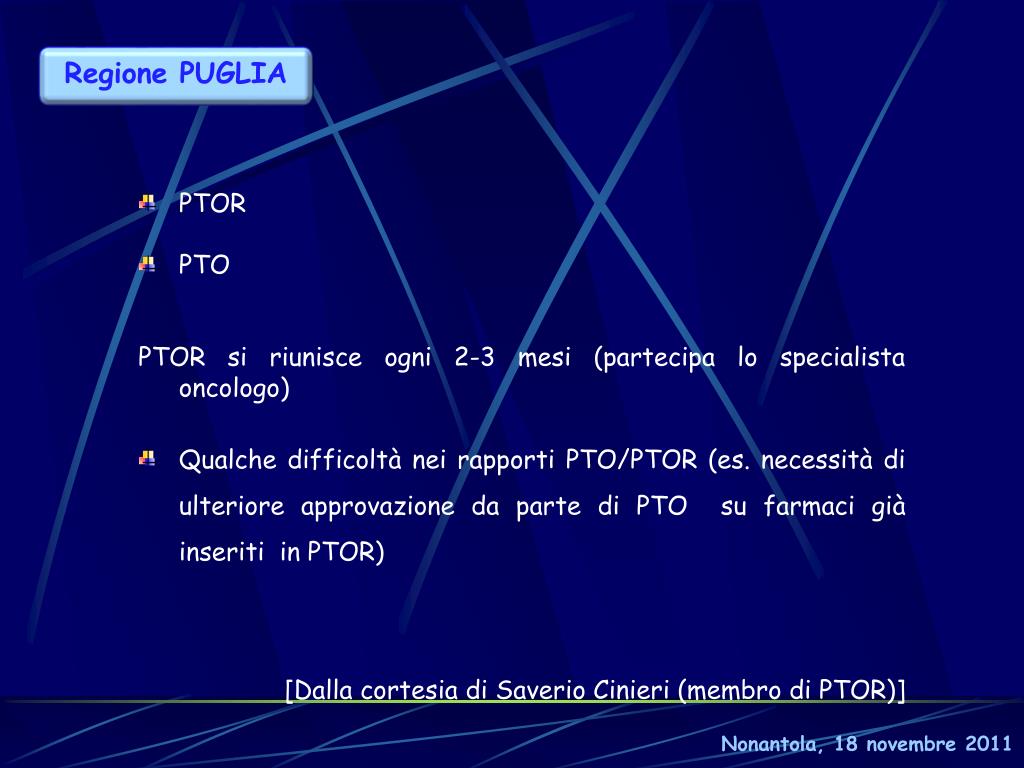 Regione PUGLIA • PTOR • PTO • PTOR si riunisce ogni 2-3 mesi (partecipa lo specialista oncologo) • Qualche difficoltà nei rapporti PTO/PTOR (es. necessità di ulteriore approvazione da parte di PTO su farmaci già inseriti in PTOR) • [Dalla cortesia di Saverio Cinieri (membro di PTOR)] Nonantola, 18 novembre 2011