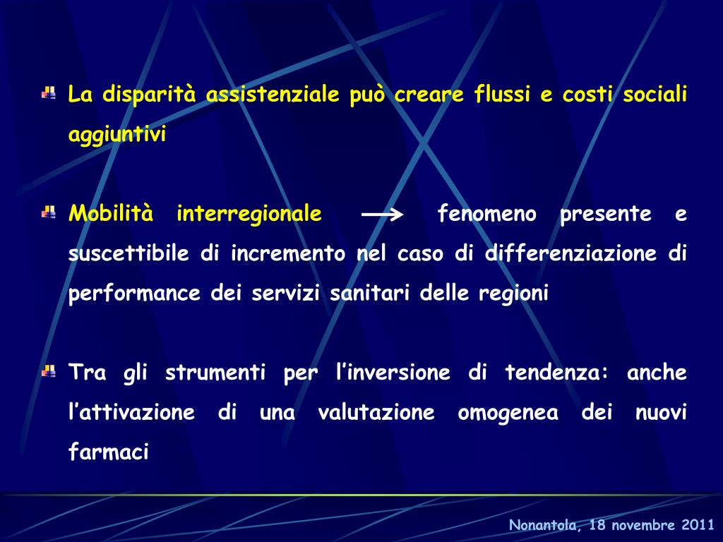 La disparità assistenziale può creare flussi e costi sociali aggiuntivi • Mobilità interregionale fenomeno presente e suscettibile di incremento nel caso di differenziazione di performance dei servizi sanitari delle regioni • Tra gli strumenti per l’inversione di tendenza: anche l’attivazione di una valutazione omogenea dei nuovi farmaci Nonantola, 18 novembre 2011