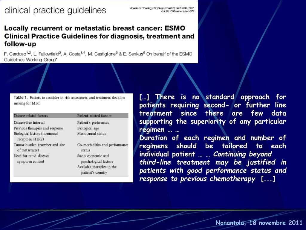 […] There is no standard approach for patients requiring second- or further line treatment since there are few data supporting the superiority of any particular regimen … … Duration of each regimen and number of regimens should be tailored to each individual patient … … Continuing beyond third-line treatment may be justified in patients with good performance status and response to previous chemotherapy [...] Nonantola, 18 novembre 2011