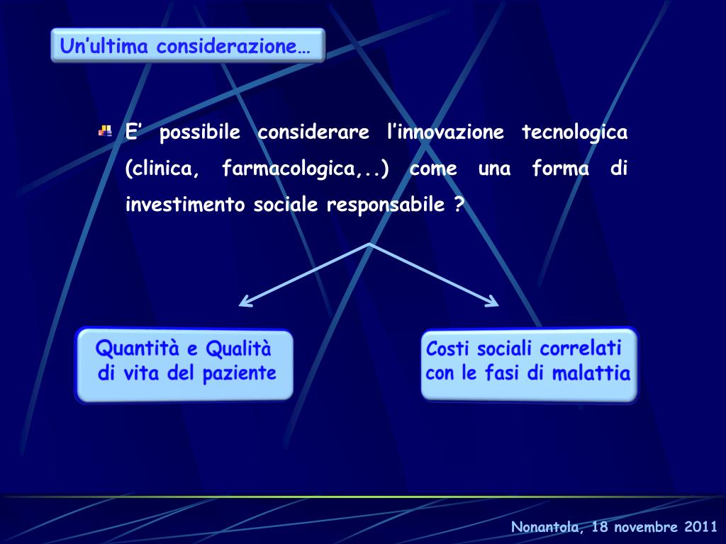 Un’ultima considerazione… • E’ possibile considerare l’innovazione tecnologica (clinica, farmacologica,..) come una forma di investimento sociale responsabile ? Quantità e Qualità di vita del paziente Costi sociali correlati con le fasi di malattia Nonantola, 18 novembre 2011