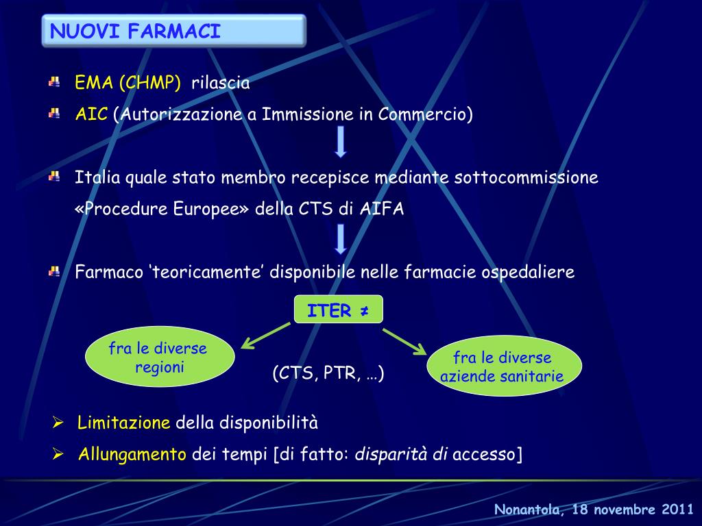 NUOVI FARMACI • EMA (CHMP) rilascia • AIC (Autorizzazione a Immissione in Commercio) • Italia quale stato membro recepisce mediante sottocommissione «Procedure Europee» della CTS di AIFA • Farmaco ‘teoricamente’ disponibile nelle farmacie ospedaliere ITER ≠ fra le diverse regioni fra le diverse aziende sanitarie (CTS, PTR, …) • Limitazione della disponibilità • Allungamento dei tempi [di fatto: disparità di accesso] Nonantola, 18 novembre 2011