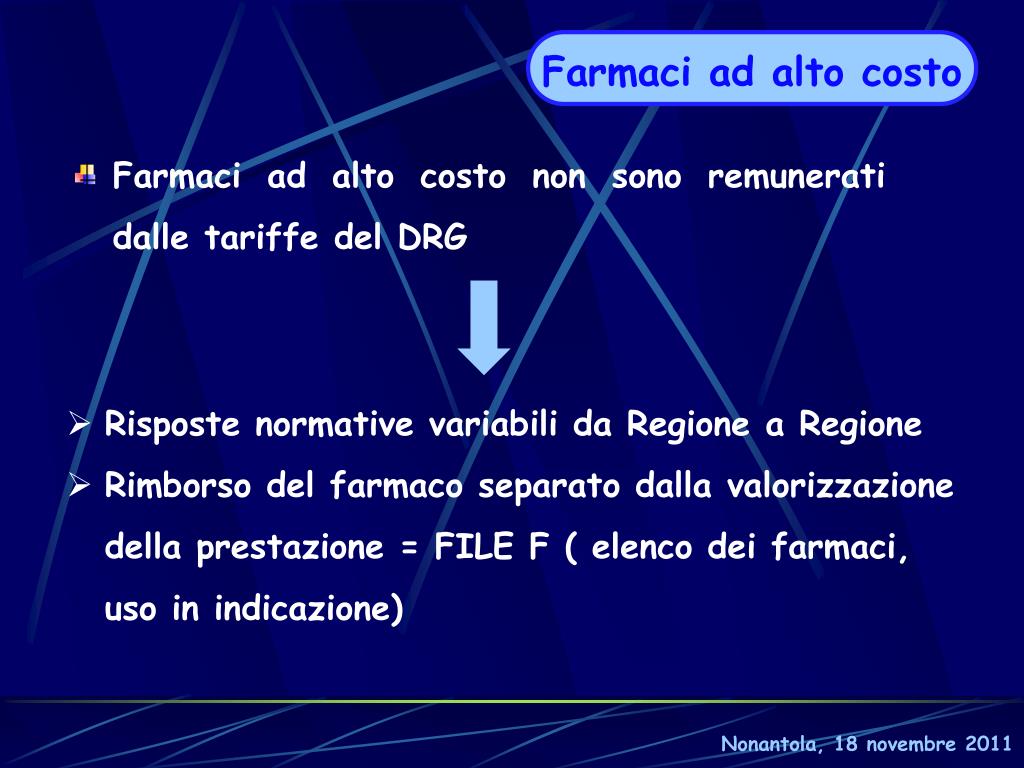 Farmaci ad alto costo • Farmaci ad alto costo non sono remunerati dalle tariffe del DRG • Risposte normative variabili da Regione a Regione • Rimborso del farmaco separato dalla valorizzazione della prestazione = FILE F ( elenco dei farmaci, uso in indicazione) Nonantola, 18 novembre 2011