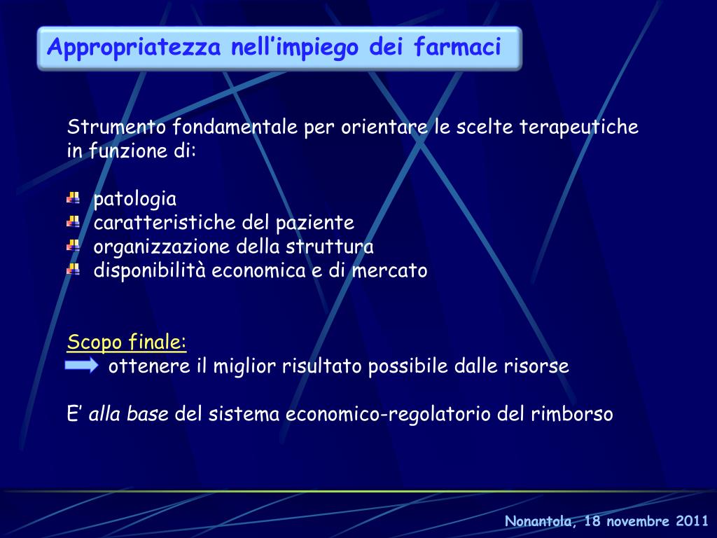 Appropriatezza nell’impiego dei farmaci • Strumento fondamentale per orientare le scelte terapeutiche • in funzione di: • patologia • caratteristiche del paziente • organizzazione della struttura • disponibilità economica e di mercato • Scopo finale: • ottenere il miglior risultato possibile dalle risorse • E’ alla base del sistema economico-regolatorio del rimborso Nonantola, 18 novembre 2011