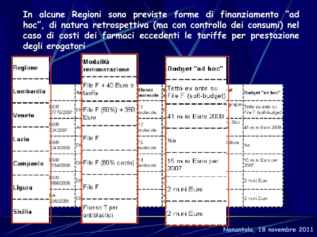 In alcune Regioni sono previste forme di finanziamento “ad hoc”, di natura retrospettiva (ma con controllo dei consumi) nel caso di costi dei farmaci eccedenti le tariffe per prestazione degli erogatori Nonantola, 18 novembre 2011