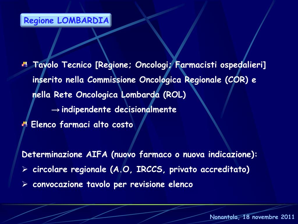 Regione LOMBARDIA • Tavolo Tecnico [Regione; Oncologi; Farmacisti ospedalieri] • inserito nella Commissione Oncologica Regionale (COR) e • nella Rete Oncologica Lombarda (ROL) • → indipendente decisionalmente • Elenco farmaci alto costo • Determinazione AIFA (nuovo farmaco o nuova indicazione): • circolare regionale (A.O, IRCCS, privato accreditato) • convocazione tavolo per revisione elenco Nonantola, 18 novembre 2011