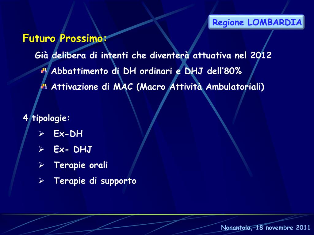 Regione LOMBARDIA • Futuro Prossimo: • Già delibera di intenti che diventerà attuativa nel 2012 • Abbattimento di DH ordinari e DHJ dell’80% • Attivazione di MAC (Macro Attività Ambulatoriali) • 4 tipologie: • Ex-DH • Ex- DHJ • Terapie orali • Terapie di supporto Nonantola, 18 novembre 2011
