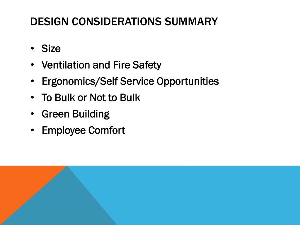 Design Considerations Summary • Size • Ventilation and Fire Safety • Ergonomics/Self Service Opportunities • To Bulk or Not to Bulk • Green Building • Employee Comfort