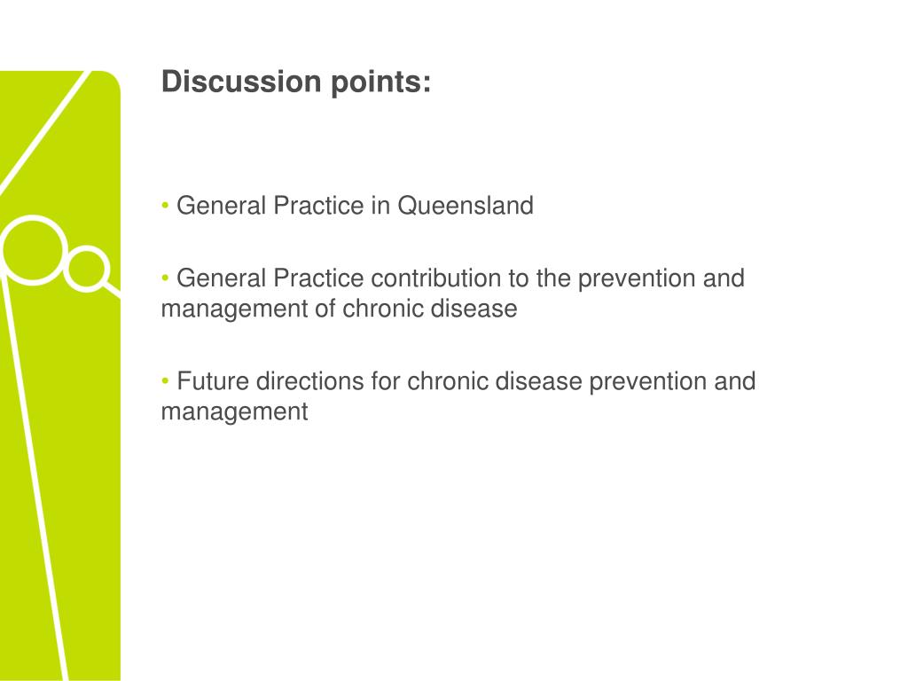 Discussion points: • General Practice in Queensland • General Practice contribution to the prevention and management of chronic disease • Future directions for chronic disease prevention and management