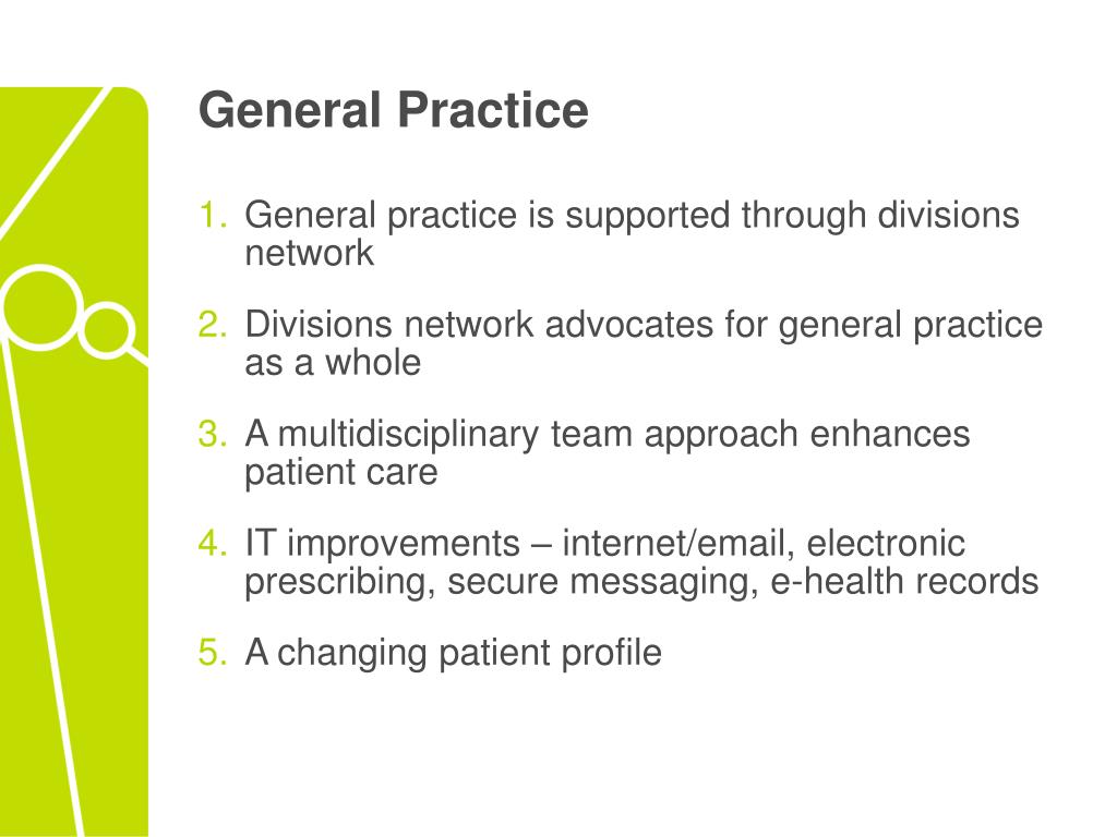 General Practice • General practice is supported through divisions network • Divisions network advocates for general practice as a whole • A multidisciplinary team approach enhances patient care • IT improvements – internet/email, electronic prescribing, secure messaging, e-health records • A changing patient profile