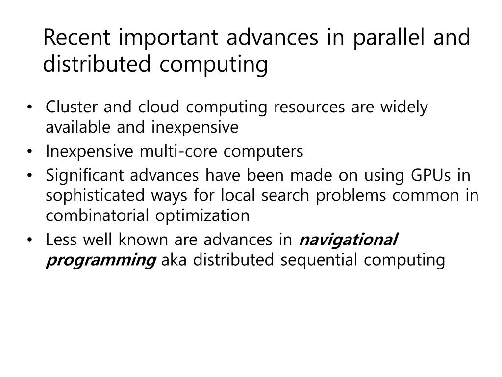 Recent important advances in parallel and distributed computing • Cluster and cloud computing resources are widely available and inexpensive • Inexpensive multi-core computers • Significant advances have been made on using GPUs in sophisticated ways for local search problems common in combinatorial optimization • Less well known are advances in navigational programming aka distributed sequential computing