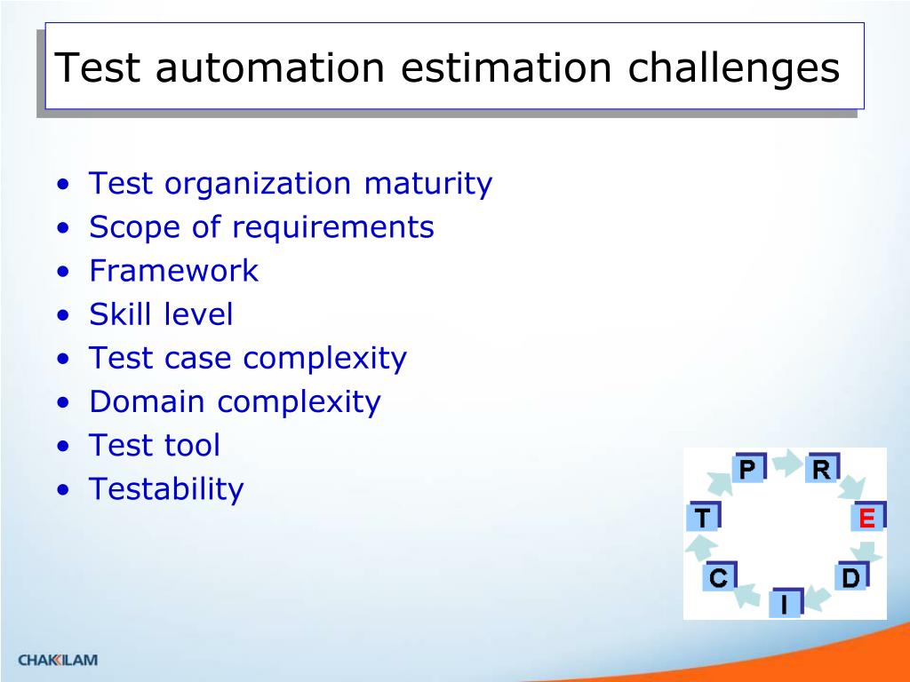 Test automation estimation challenges Test organization maturity Scope of requirements Framework Skill level Test case complexity Domain complexity Test tool Testability