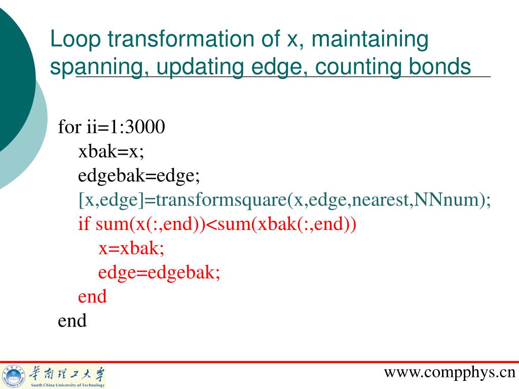 Loop transformation of x, maintaining spanning, updating edge, counting bonds for ii=1:3000 xbak=x; edgebak=edge; [x,edge]=transformsquare(x,edge,nearest,NNnum); if sum(x(:,end))<sum(xbak(:,end)) x=xbak; edge=edgebak; end end