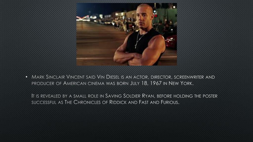 Mark Sinclair Vincent said Vin Diesel is an actor, director, screenwriter and producer of American cinema was born July 18, 1967 in New York. It is revealed by a small role in Saving Soldier Ryan, before holding the poster successful as The Chronicles of Riddick and Fast and Furious.