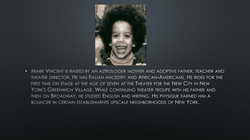 Mark Vincent is raised by an astrologer mother and adoptive father, teacher and theater director. He has Italian ancestry and African-Americans. He rides for the first time on stage at the age of seven at the Theater for the New City in New York's Greenwich Village. While continuing theater troupe with his father and then on Broadway, he studied English and writing. His physique earned him a bouncer in certain establishments upscale neighborhoods of New York.
