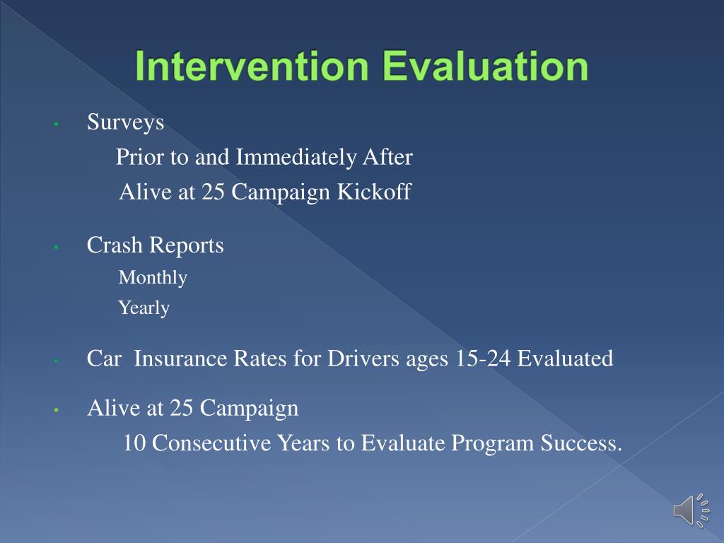 Intervention Evaluation • Surveys Prior to and Immediately After Alive at 25 Campaign Kickoff • Crash Reports Monthly Yearly • Car Insurance Rates for Drivers ages 15-24 Evaluated • Alive at 25 Campaign 10 Consecutive Years to Evaluate Program Success.