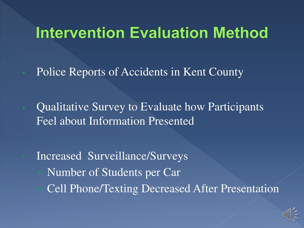 Intervention Evaluation Method • Police Reports of Accidents in Kent County • Qualitative Survey to Evaluate how Participants Feel about Information Presented • Increased Surveillance/Surveys • Number of Students per Car • Cell Phone/Texting Decreased After Presentation