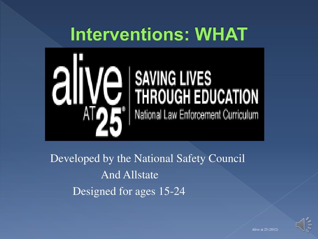 Interventions: WHAT Developed by the National Safety Council And Allstate Designed for ages 15-24 Alive at 25 (2012)