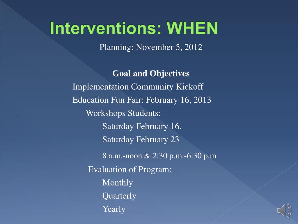 Interventions: WHEN Planning: November 5, 2012 Goal and Objectives Implementation Community Kickoff Education Fun Fair: February 16, 2013 Workshops Students: Saturday February 16. Saturday February 23 8 a.m.-noon & 2:30 p.m.-6:30 p.m Evaluation of Program: Monthly Quarterly Yearly