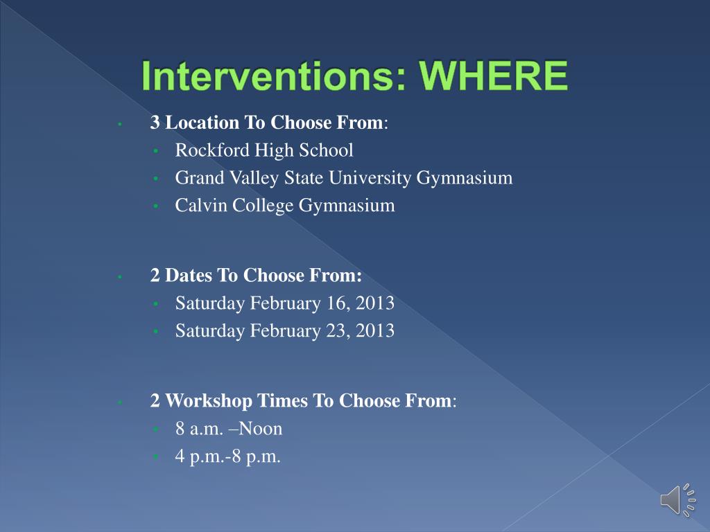 Interventions: WHERE • 3 Location To Choose From: • Rockford High School • Grand Valley State University Gymnasium • Calvin College Gymnasium • 2 Dates To Choose From: • Saturday February 16, 2013 • Saturday February 23, 2013 • 2 Workshop Times To Choose From: • 8 a.m. –Noon • 4 p.m.-8 p.m.