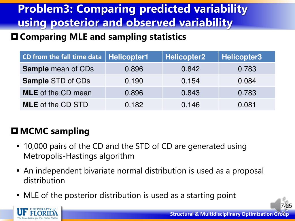 Problem3: Comparing predicted variability using posterior and observed variability • Comparing MLE and sampling statistics • MCMC sampling • 10,000 pairs of the CD and the STD of CD are generated using Metropolis-Hastings algorithm • An independent bivariate normal distribution is used as a proposal distribution • MLE of the posterior distribution is used as a starting point
