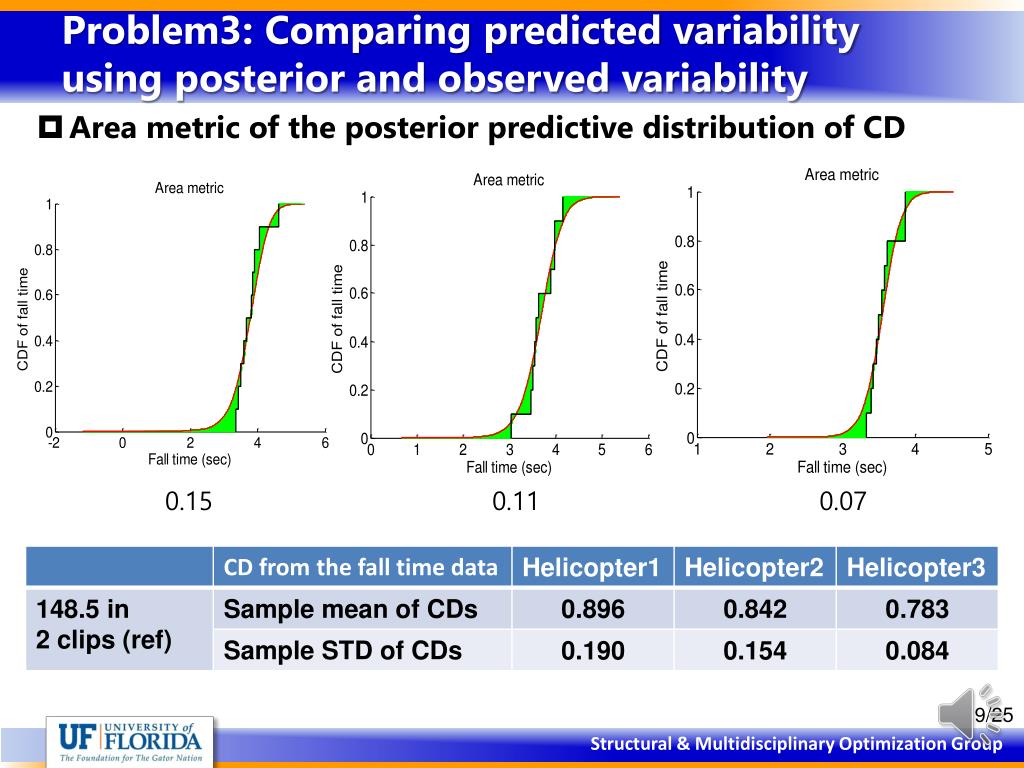 Problem3: Comparing predicted variability using posterior and observed variability • Handling the epistemic uncertainty due to finite sample • How to handle epistemic uncertainty in the CD and the test standard deviation estimates? • Comparing the posterior predictive distribution of the fall time and the empirical CDF of tests (combining epistemic and aleatory uncertainties) • Using p-box with 95% confidence interval of epistemic uncertainty (separating epistemic and alreatory uncertainties)