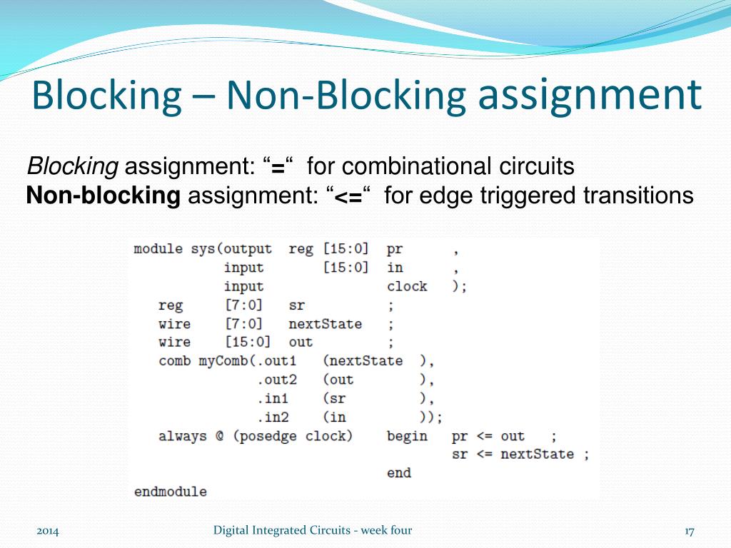 Blocking – Non-Blocking assignment Blocking assignment: “=“for combinational circuits Non-blocking assignment: “<=“ for edge triggered transitions Digital Integrated Circuits - week four