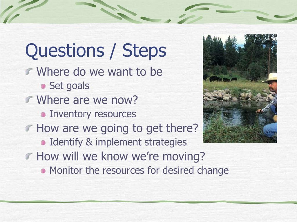 Questions / Steps • Where do we want to be • Set goals • Where are we now? • Inventory resources • How are we going to get there? • Identify & implement strategies • How will we know we’re moving? • Monitor the resources for desired change