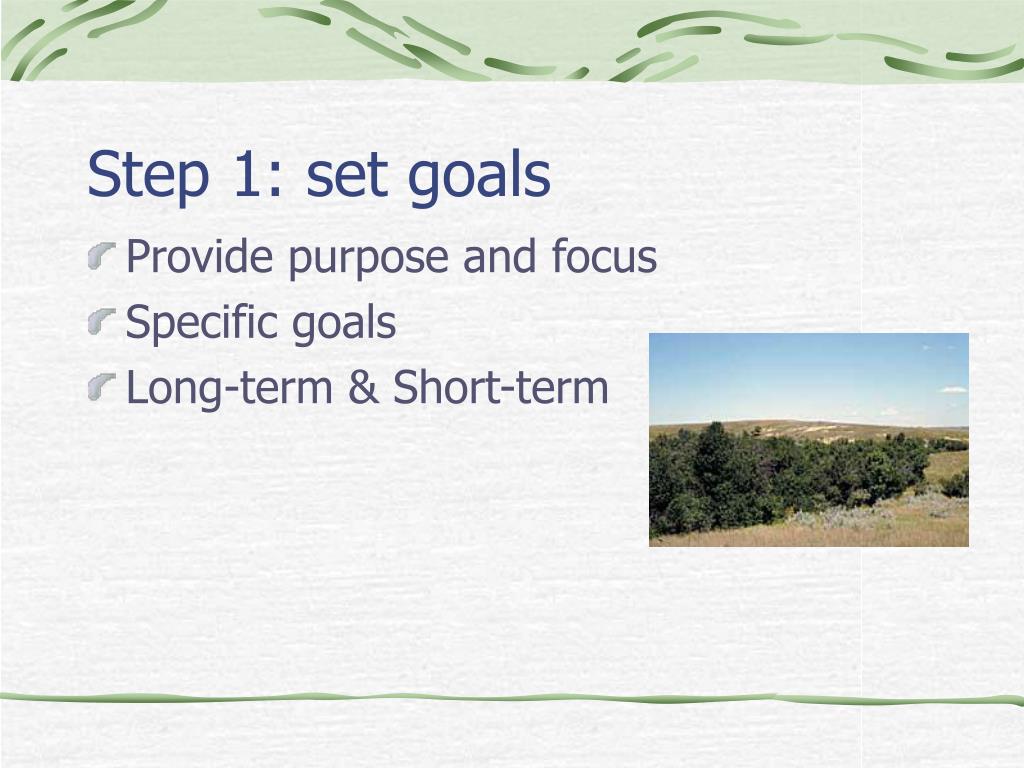 Step 1: set goals • Provide purpose and focus • Specific goals • Long-term & Short-term