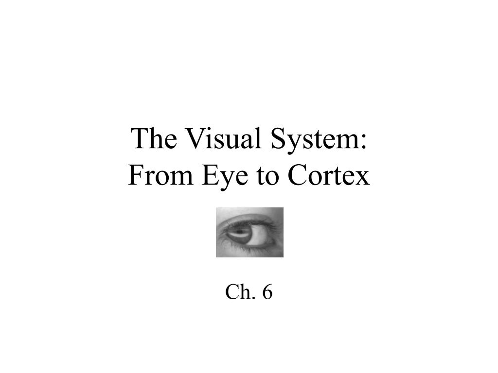The Visual System: From Eye to Cortex. Ch. 6. Outline. The Eye The Retina Visual Transduction by Rhodopsin From Retina to Primary Visual Cortex. The Eyes. Structure : review the major structures of the eye (diagram given in class)