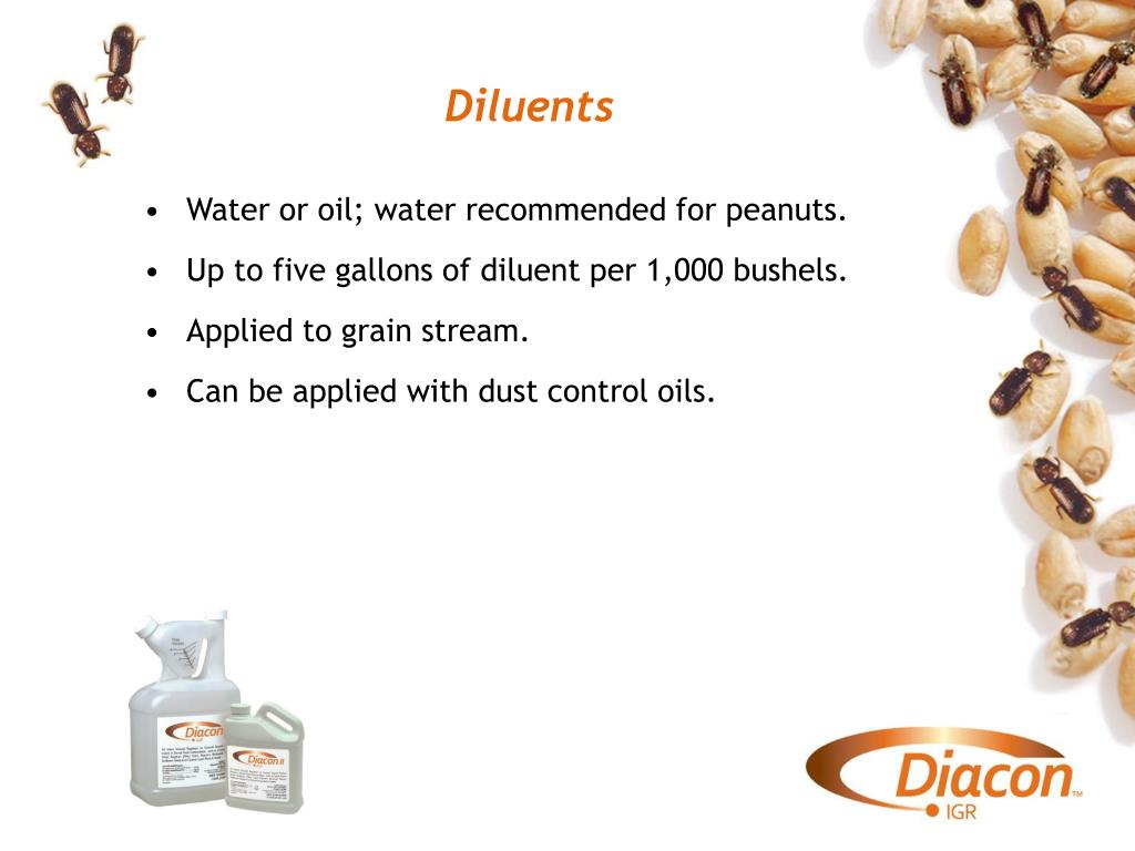 Diacon® II IGR Use Patterns • On grain • Bin or silo surface treatment • Fogging/Aqueous spray • Additional Use Areas • Food processing - breweries • food service - candy processing • food preparation - pet food production • Mills - grocery stores • Bakeries - rail cars • Restaurants - ships • Taverns - trucks • industrial buildings - bottling facilities • cereal processing • In addition spray on, packaged, canned, bottled foodstuff, boxes, liners, pallets.