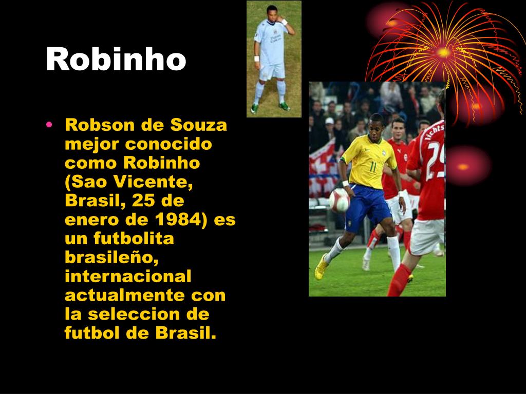 Robinho • Robson de Souza mejor conocido como Robinho (Sao Vicente, Brasil, 25 de enero de 1984) es un futbolita brasileño, internacional actualmente con la seleccion de futbol de Brasil.