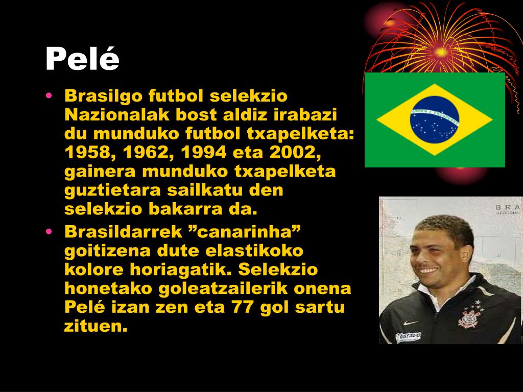 Pelé • Brasilgo futbol selekzio Nazionalak bost aldiz irabazi du munduko futbol txapelketa: 1958, 1962, 1994 eta 2002, gainera munduko txapelketa guztietara sailkatu den selekzio bakarra da. • Brasildarrek ”canarinha” goitizena dute elastikoko kolore horiagatik. Selekzio honetako goleatzailerik onena Pelé izan zen eta 77 gol sartu zituen.