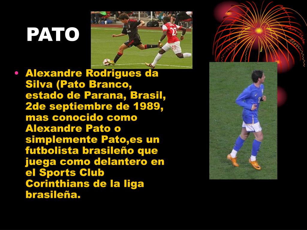 PATO • Alexandre Rodrigues da Silva (Pato Branco, estado de Parana, Brasil, 2de septiembre de 1989, mas conocido como Alexandre Pato o simplemente Pato,es un futbolista brasileño que juega como delantero en el Sports Club Corinthians de la liga brasileña.