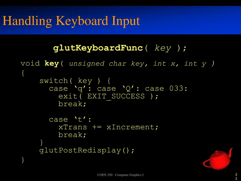 Handling Keyboard Input glutKeyboardFunc( key ); void key( unsigned char key, int x, int y ) { switch( key ) { case ‘q’: case ‘Q’: case 033: exit( EXIT_SUCCESS ); break; case ‘t’: xTrans += xIncrement; break; } glutPostRedisplay(); } COEN 290 - Computer Graphics I