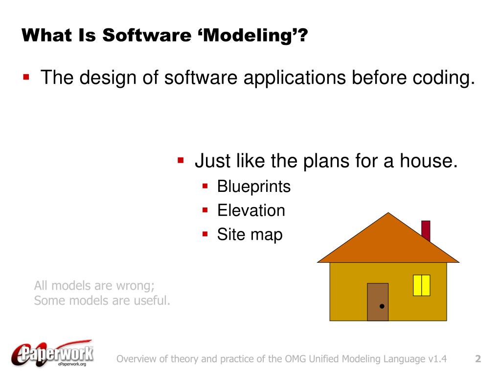 What Is Software ‘Modeling’? • The design of software applications before coding. • Just like the plans for a house. • Blueprints • Elevation • Site map All models are wrong; Some models are useful. Overview of theory and practice of the OMG Unified Modeling Language v1.4
