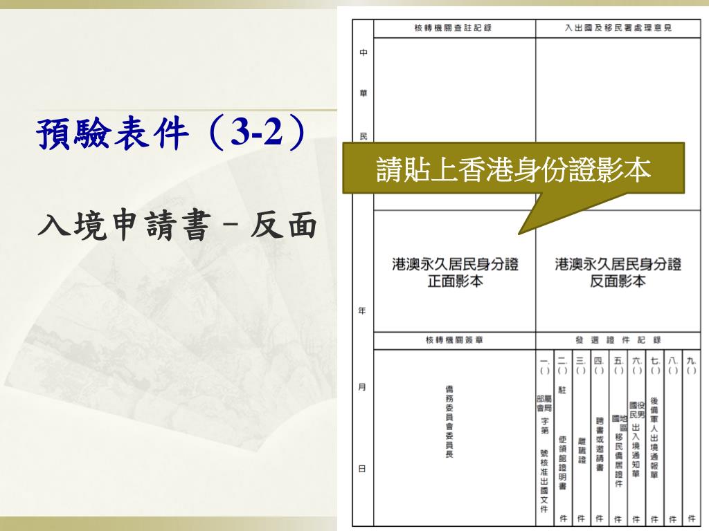 預驗表件(3-2)入境申請書–反面 請貼上香港身份證影本