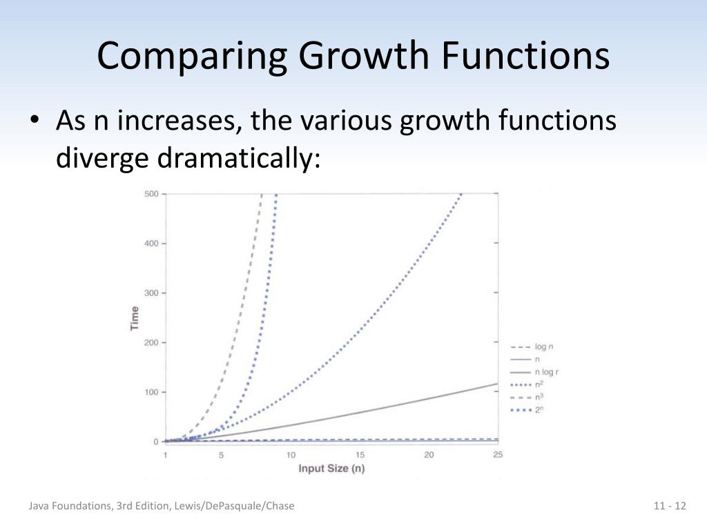 Comparing Growth Functions • As n increases, the various growth functions diverge dramatically: Java Foundations, 3rd Edition, Lewis/DePasquale/Chase