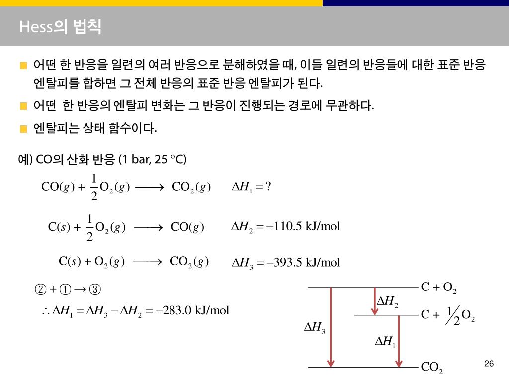 Hess의 법칙 • 어떤 한 반응을 일련의 여러 반응으로 분해하였을 때, 이들 일련의 반응들에 대한 표준 반응 엔탈피를 합하면 그 전체 반응의 표준 반응 엔탈피가 된다. • 어떤 한 반응의 엔탈피 변화는 그 반응이 진행되는 경로에 무관하다. • 엔탈피는 상태 함수이다. 예) CO의 산화 반응 (1 bar, 25 C) ② + ① → ③