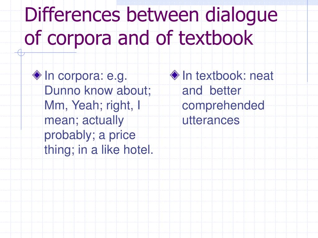 In corpora: e.g. Dunno know about; Mm, Yeah; right, I mean; actually probably; a price thing; in a like hotel. In textbook: neat and better comprehendedutterances Differences between dialogue of corpora and of textbook