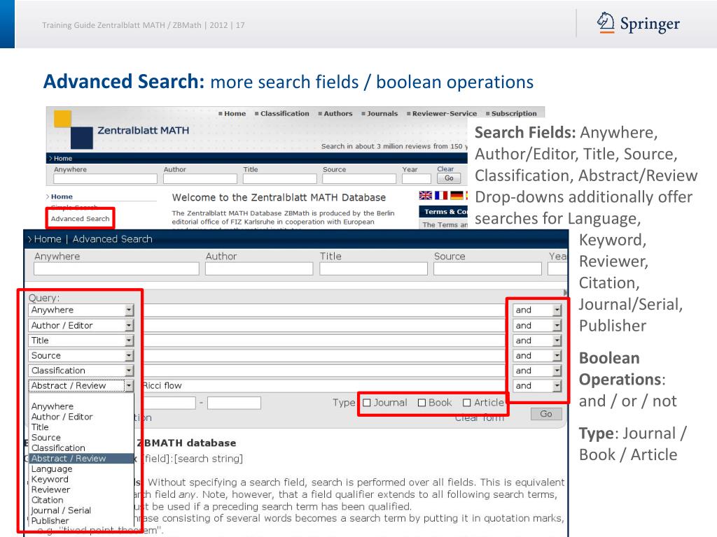 Advanced Search: more search fields / boolean operations Search Fields: Anywhere, Author/Editor, Title, Source, Classification, Abstract/Review Drop-downs additionally offer searches for Language, Keyword, Reviewer, Citation, Journal/Serial, Publisher Boolean Operations: and / or / not Type: Journal / Book / Article