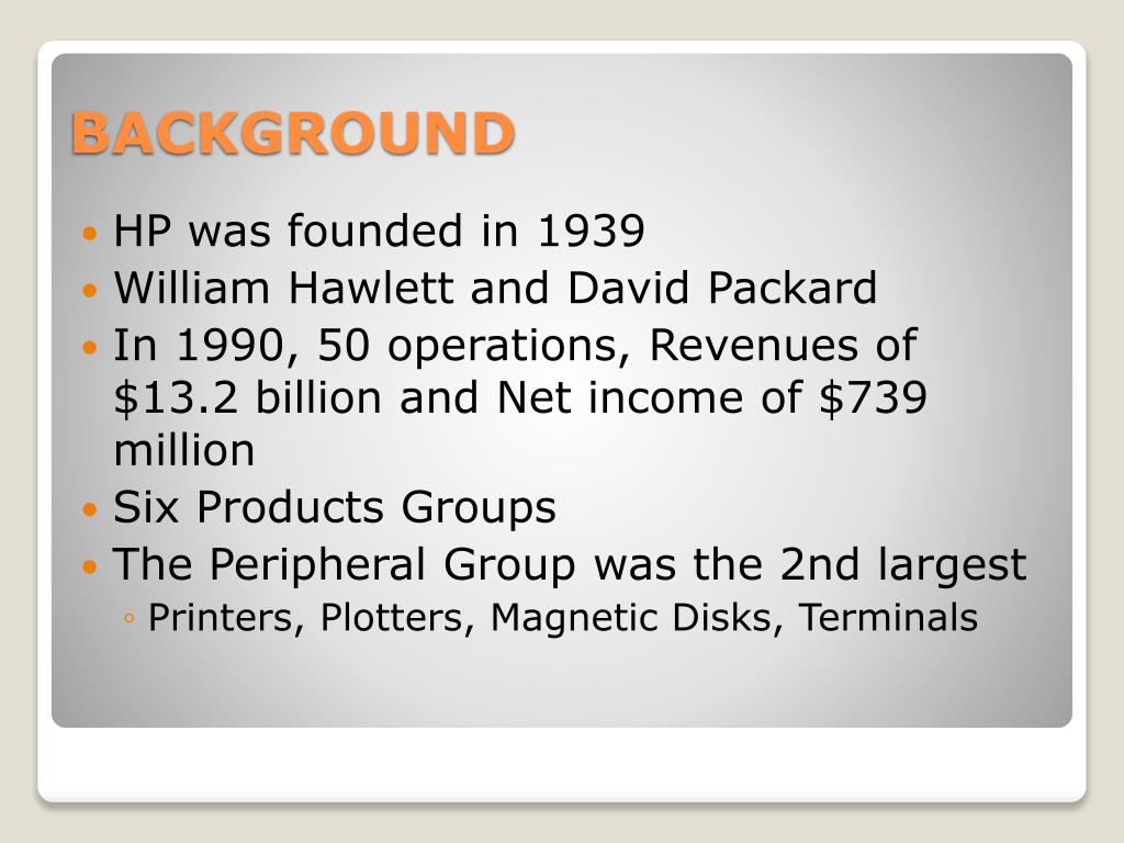 HP wasfounded in 1939 • William HawlettandDavidPackard • In 1990, 50 operations, Revenues of $13.2 billionand Net income of $739 million • SixProductsGroups • ThePeripheralGroupwasthe 2nd largest • Printers, Plotters, MagneticDisks, Terminals BACKGROUND