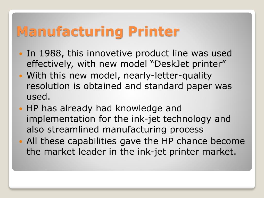 In 1988, thisinnovetiveproductlinewasusedeffectively, withnew model “DeskJet printer” • Withthisnew model, nearly-letter-qualityresolution is obtainedandstandardpaperwasused. • HP has already had knowledgeandimplementationfortheink-jet technologyandalsostreamlinedmanufacturingprocess • Allthesecapabilitiesgavethe HP chancebecomethe market leader in theink-jet printer market. Manufacturing Printer