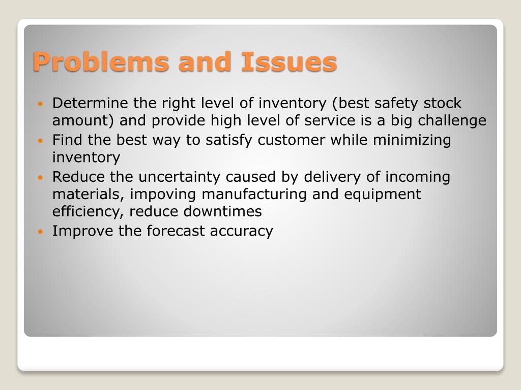 Determinetherightlevel of inventory (bestsafetystockamount) andprovidehighlevel of service is a bigchallenge • Findthebestwaytosatisfycustomerwhileminimizinginventory • Reducetheuncertaintycausedbydelivery of incomingmaterials, impovingmanufacturingandequipmentefficiency, reducedowntimes • Improvetheforecastaccuracy ProblemsandIssues