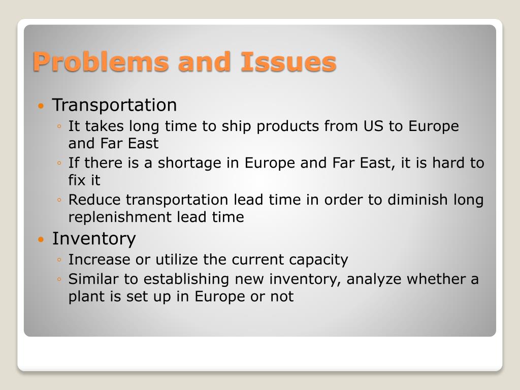 Transportation • Ittakeslong time toshipproductsfrom US toEuropeand Far East • Ifthere is a shortage in Europeand Far East, it is hard tofix it • Reducetransportationlead time in ordertodiminishlongreplenishmentlead time • Inventory • Increaseorutilizethecurrentcapacity • Similartoestablishingnewinventory, analyzewhether a plant is set up in Europeor not ProblemsandIssues