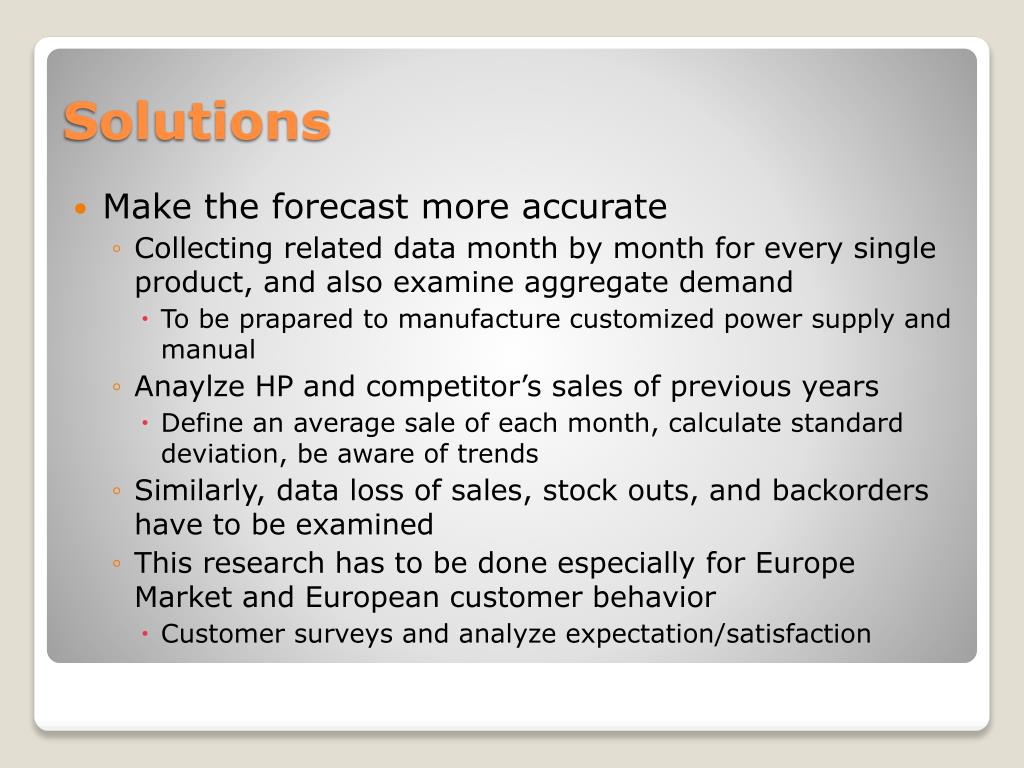 Make the forecast more accurate • Collecting relateddata month by month for every single product, andalsoexamineaggregatedemand • To be praparedtomanufacturecustomizedpowersupplyandmanual • Anaylze HP andcompetitor’ssales of previousyears • Define an averagesale of eachmonth, calculatestandarddeviation, be aware of trends • Similarly, data loss of sales, stockouts, andbackordershaveto be examined • This research has to be done especially for Europe Market and European customer behavior • Customersurveysandanalyzeexpectation/satisfaction Solutions