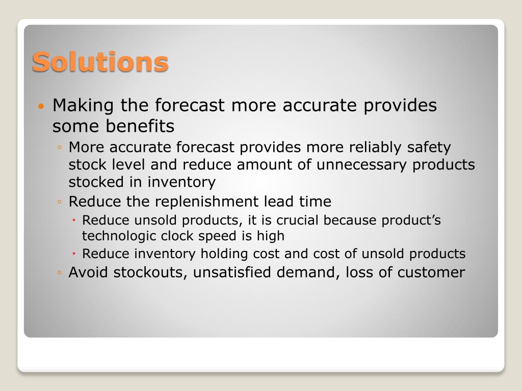 Making the forecast more accurateprovidessomebenefits • More accurate forecast provides more reliably safety stock level and reduce amount of unnecessary productsstocked in inventory • Reducethereplenishmentlead time • Reduceunsoldproducts, it is crucialbecauseproduct’stechnologicclockspeed is high • Reduceinventory holding costandcost of unsoldproducts • Avoidstockouts, unsatisfieddemand, loss of customer Solutions