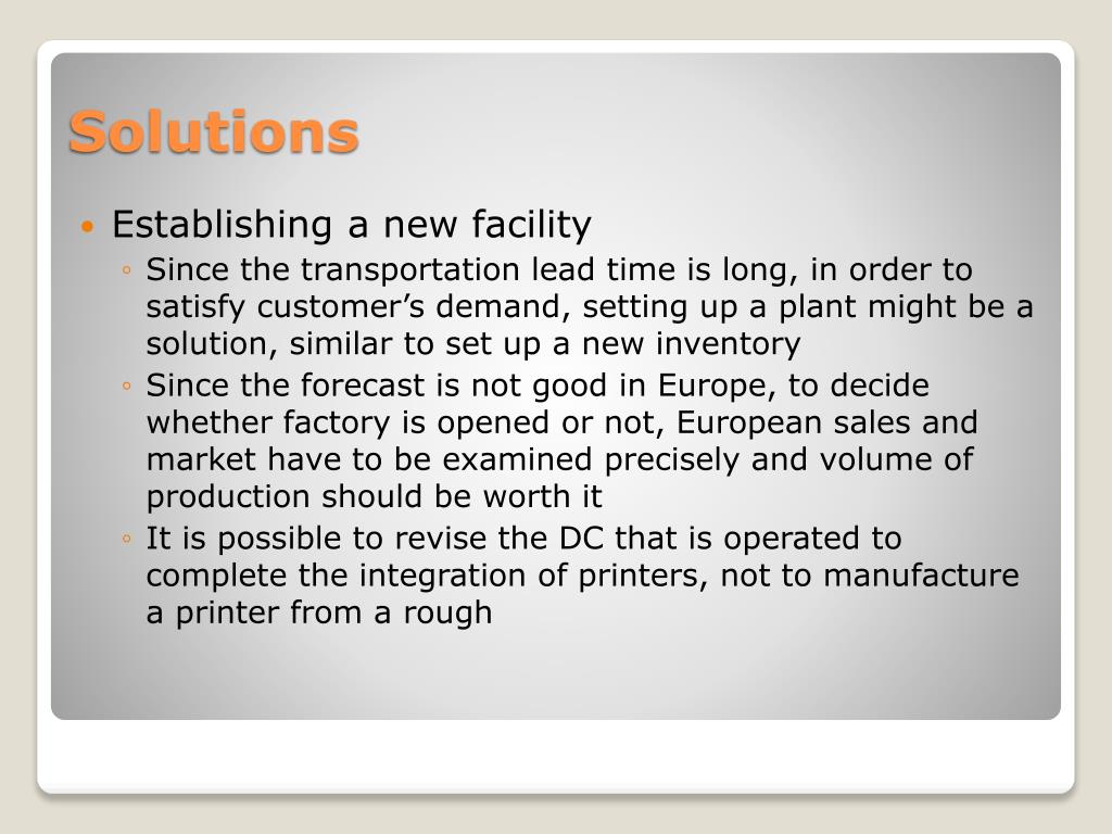 Establishing a newfacility • Since thetransportationlead time is long, in ordertosatisfycustomer’sdemand, settingup a plantmight be a solution, similarto set up a newinventory • Since theforecast is not good in Europe, todecidewhetherfactory is openedor not, Europeansalesand market haveto be examinedpreciselyandvolume of productionshould be worth it • It is possibletorevisethe DC that is operatedtocompletetheintegration of printers, not tomanufacture a printer from a rough Solutions